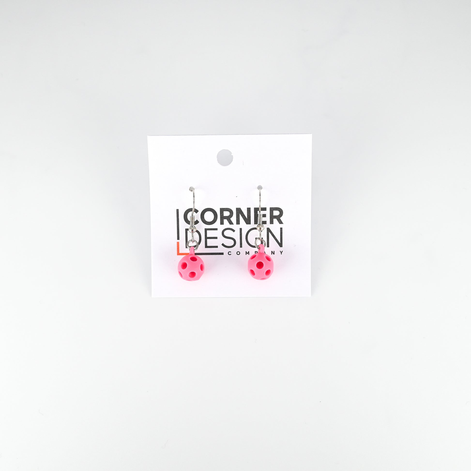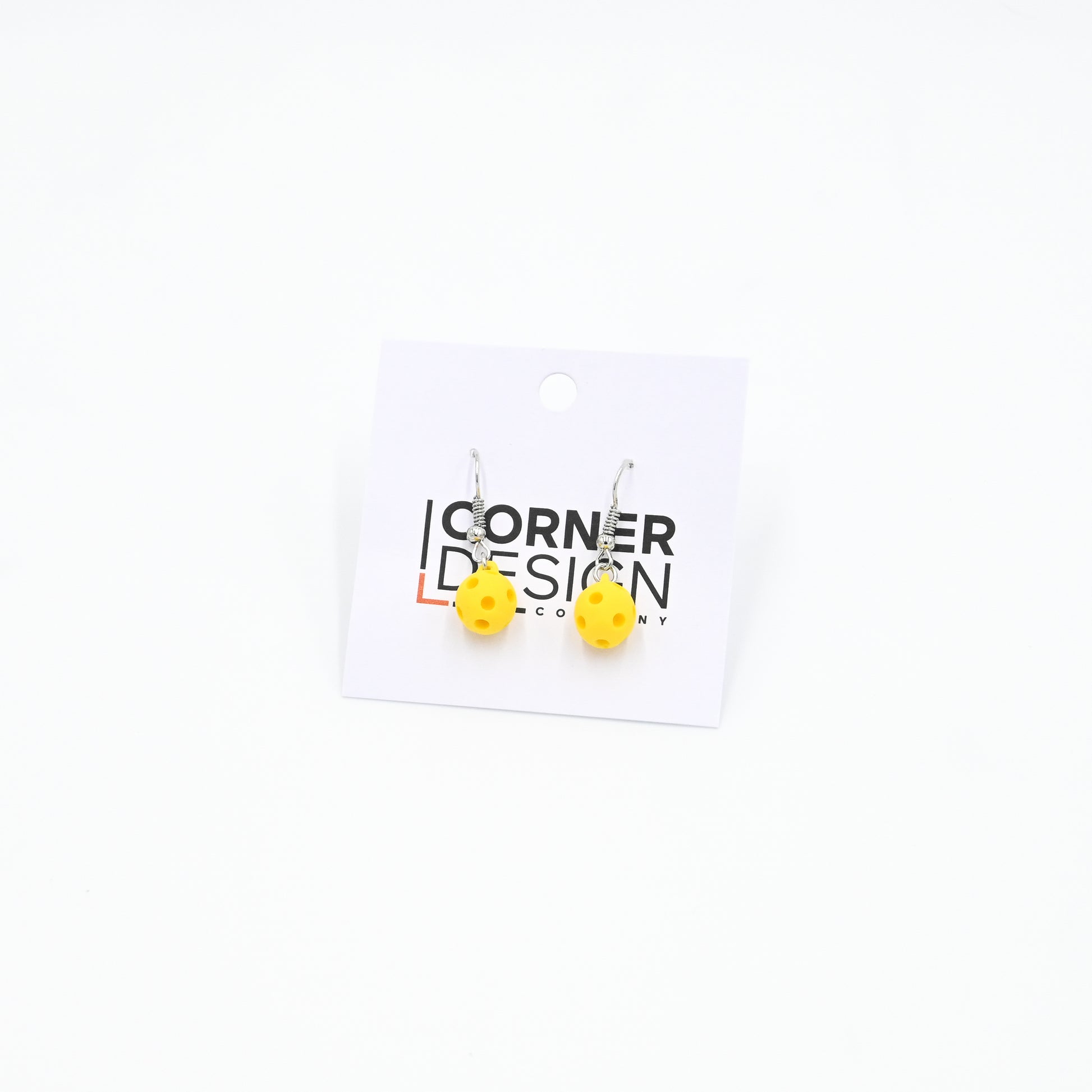 Pickleball dangle earrings measuring 1cm in diameter. They dangle 1.25" from the ear hole to the bottom of the ball.