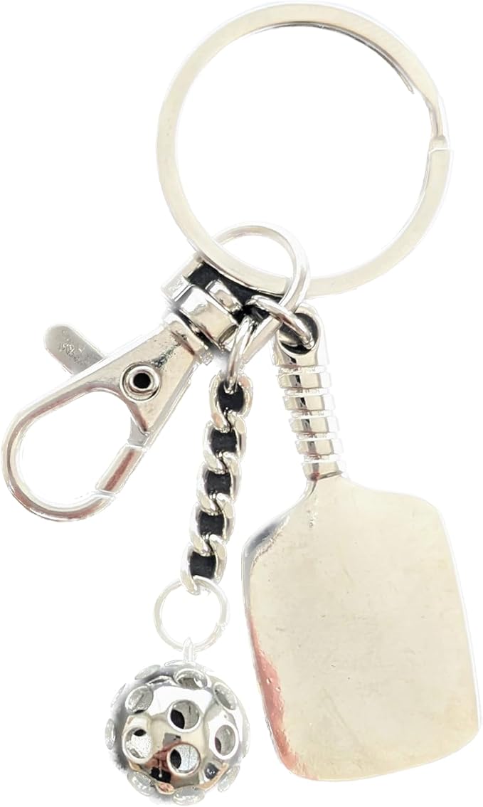 This cute pickleball keychain is fun and unique, and as warm and inviting as an open pickleball court. Beautiful silver color with ball and paddle charms. This keychain for women and men is made out of 100% fabric and a sturdy metal, ensuring your lanyard will be durable for long-term use. Ball charm measures ~0.5" and the paddle charm measures ~1"x2". This keychain comes with. aring and spring clasp for easy attachment. The perfect pickelball gift for women or men. Give this to the pickleball fanatic in your life. Designed by a small mom-and-pop shop in the USA who were looking for fun pickleball swag to give as gifts and decided to create it themselves!